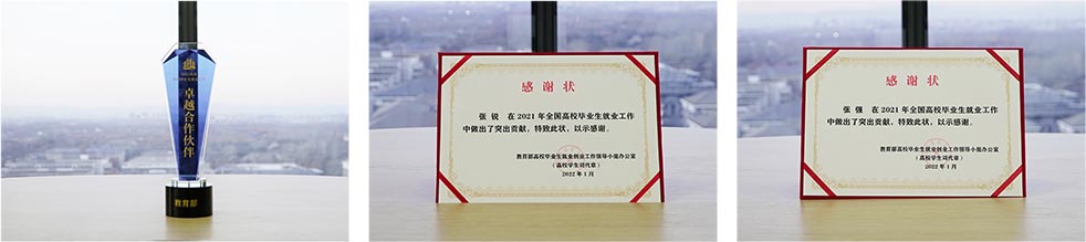2021年,万学在高校毕业生就业工作方面贡献卓越,获教育部颁发“卓越合作伙伴”荣誉奖杯,并为多多28董事长张锐、执行总裁张强颁发感谢状。